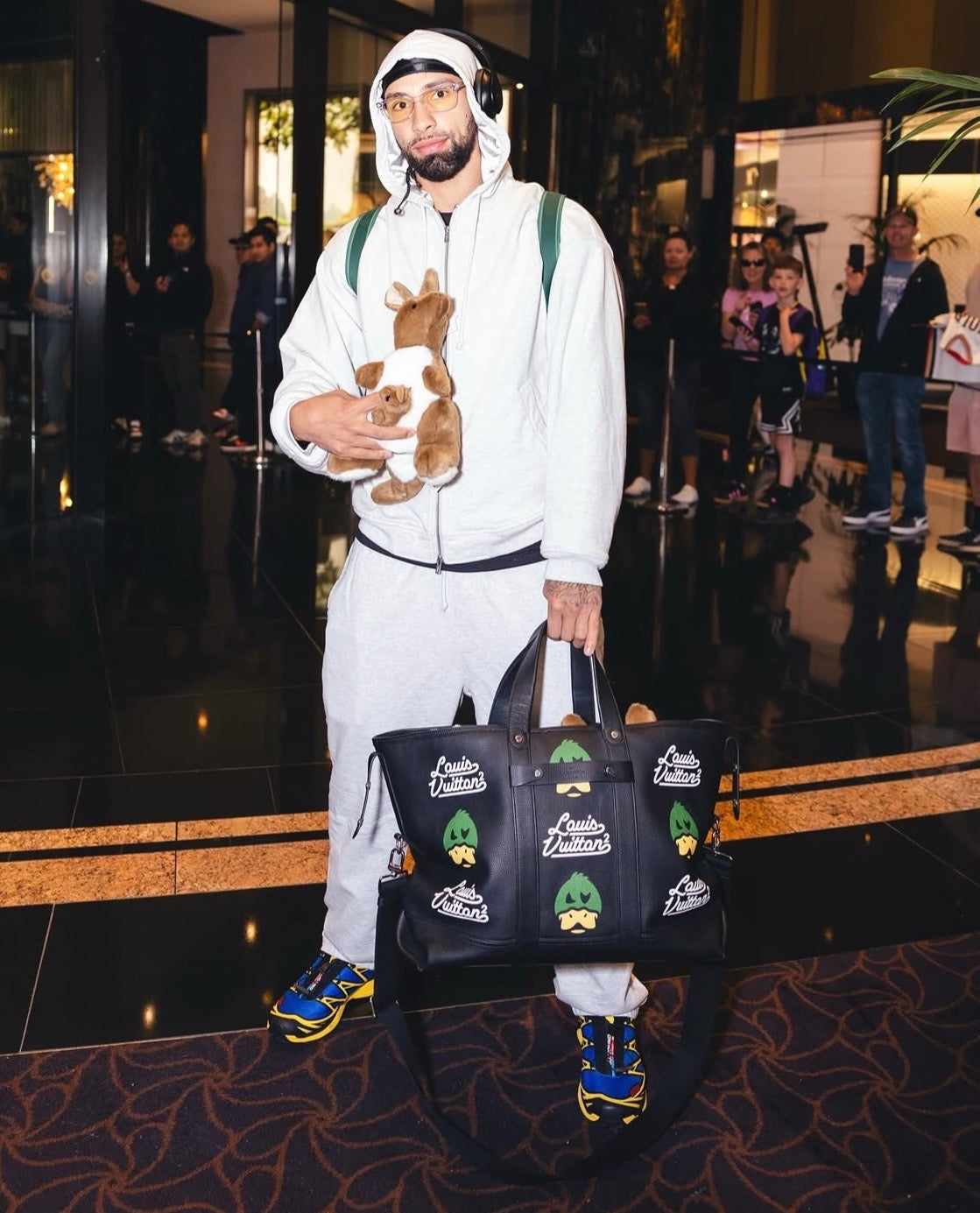 Jarred Vanderbilt seen here at the 2025 Paris Fashion week Louis Vuitton Show, wearing a "Stephen Sprouse" Duffle Bag - supplied by Curated By Charbel.